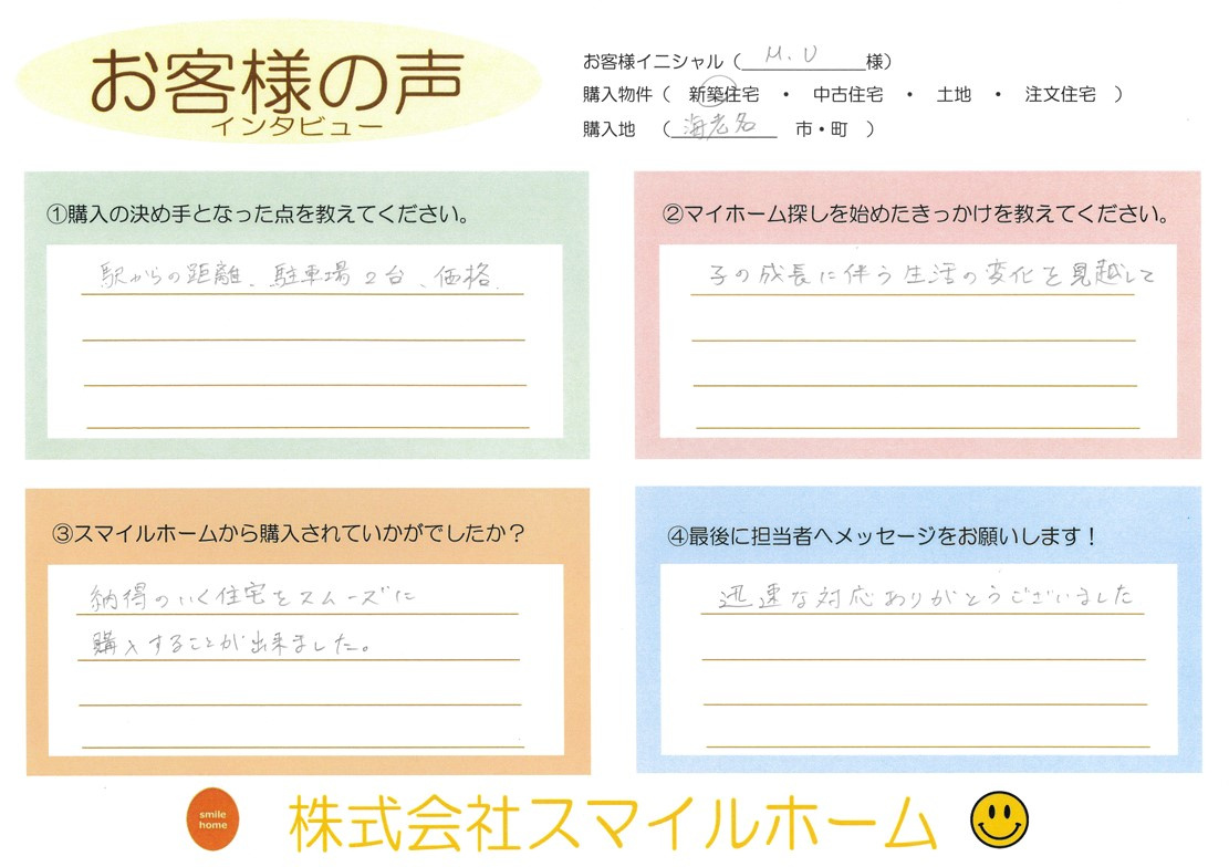 伊勢原市・大和市の不動産|スマイルホーム > お客様の声一覧 > 海老名市【新築戸建】M.U様